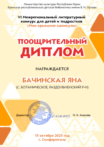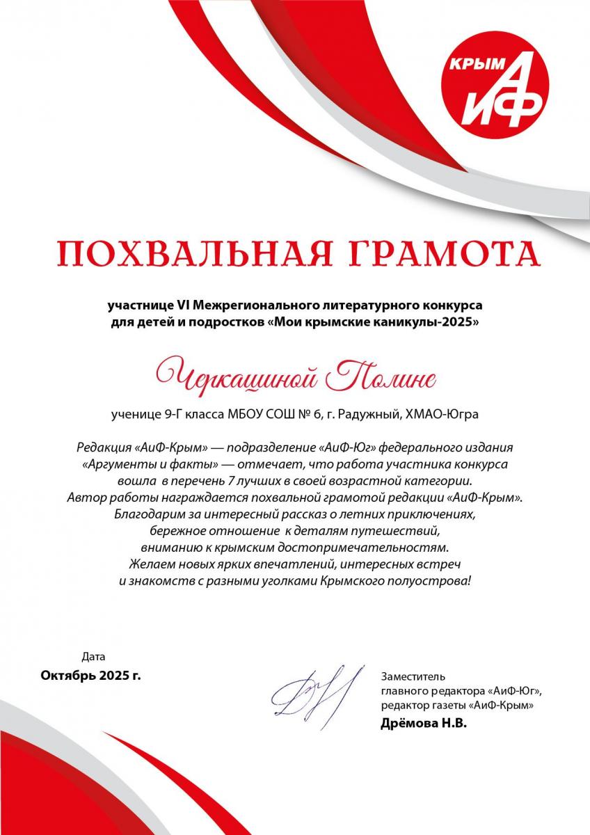 Редакция «Аргументы и факты-Крым» отметила Поощрительной грамотой Черкашину Полину – читательницу Ручьевской сельской библиотеки.