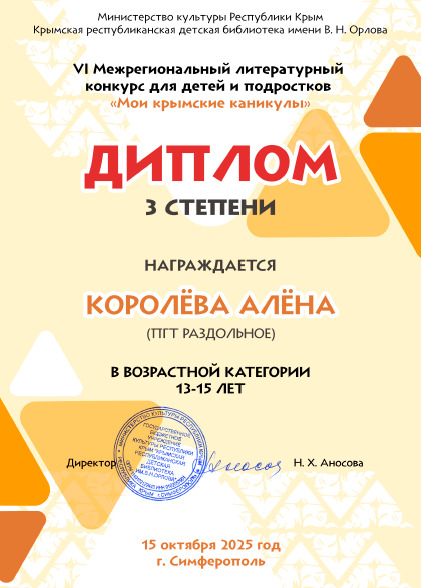 3 место – Королева Алена читательница Раздольненской центральной районной детской библиотеки;