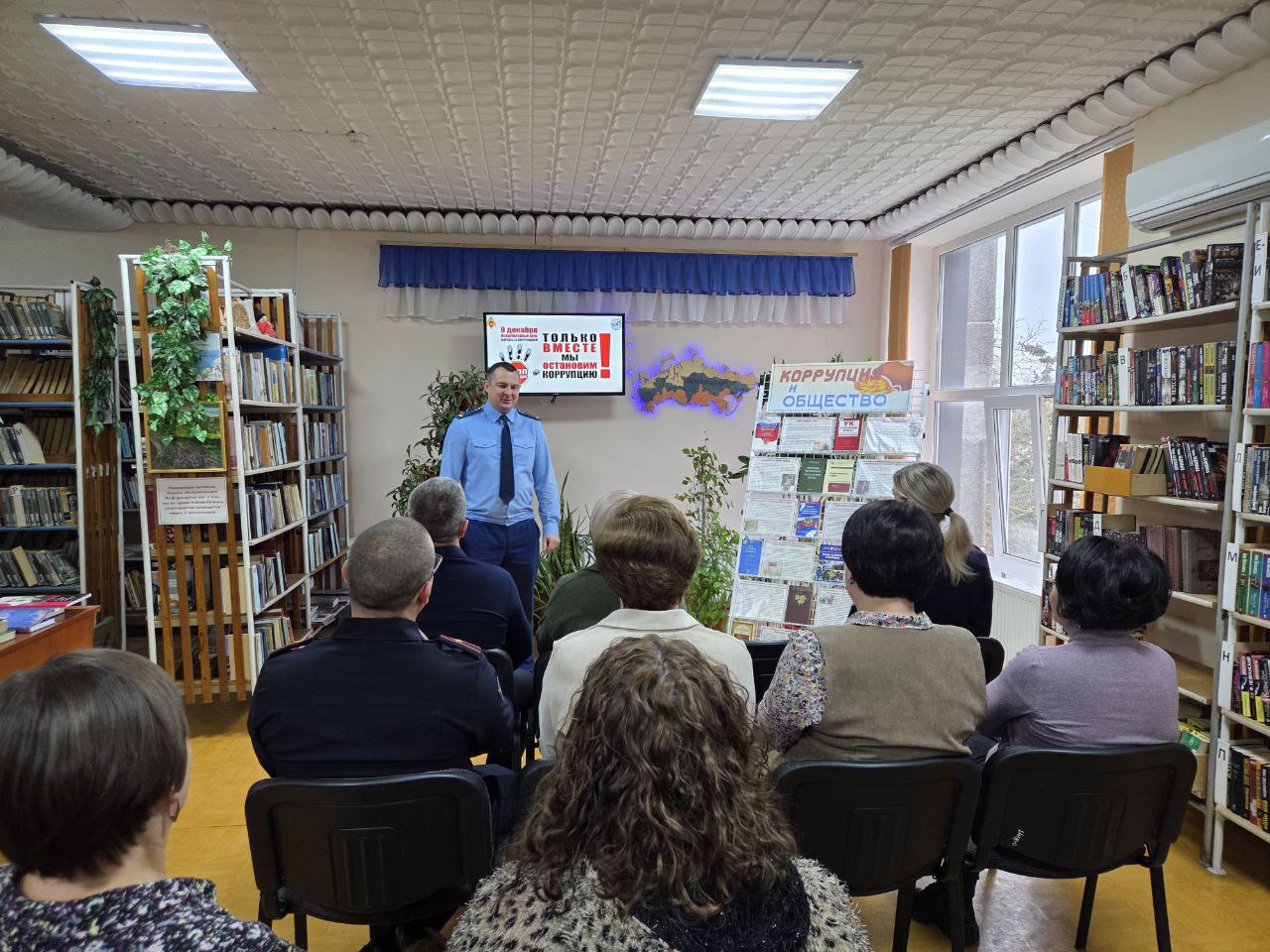 В Раздольненской районной библиотеке им. А.И.Домбровского была организована лекция, где представители прокуратуры и полиции разъяснили правовые основы противодействия коррупции, виды ответственности и алгоритмы действий в случае столкновения с подобными правонарушениями, а также желающие могли ознакомиться с тематической выставкой, наглядно демонстрирующей принципы честности, открытости и законности в работе органов власти.