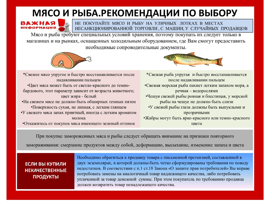 Покупайте мясную и рыбную продукцию в стационарных предприятиях торговли, а также в специализированных торговых точках, где созданы условия для хранения данной продукции. Не следует покупать продукты в неустановленных местах: у остановок транспорта, за территорией рынка, да и просто на улице.
