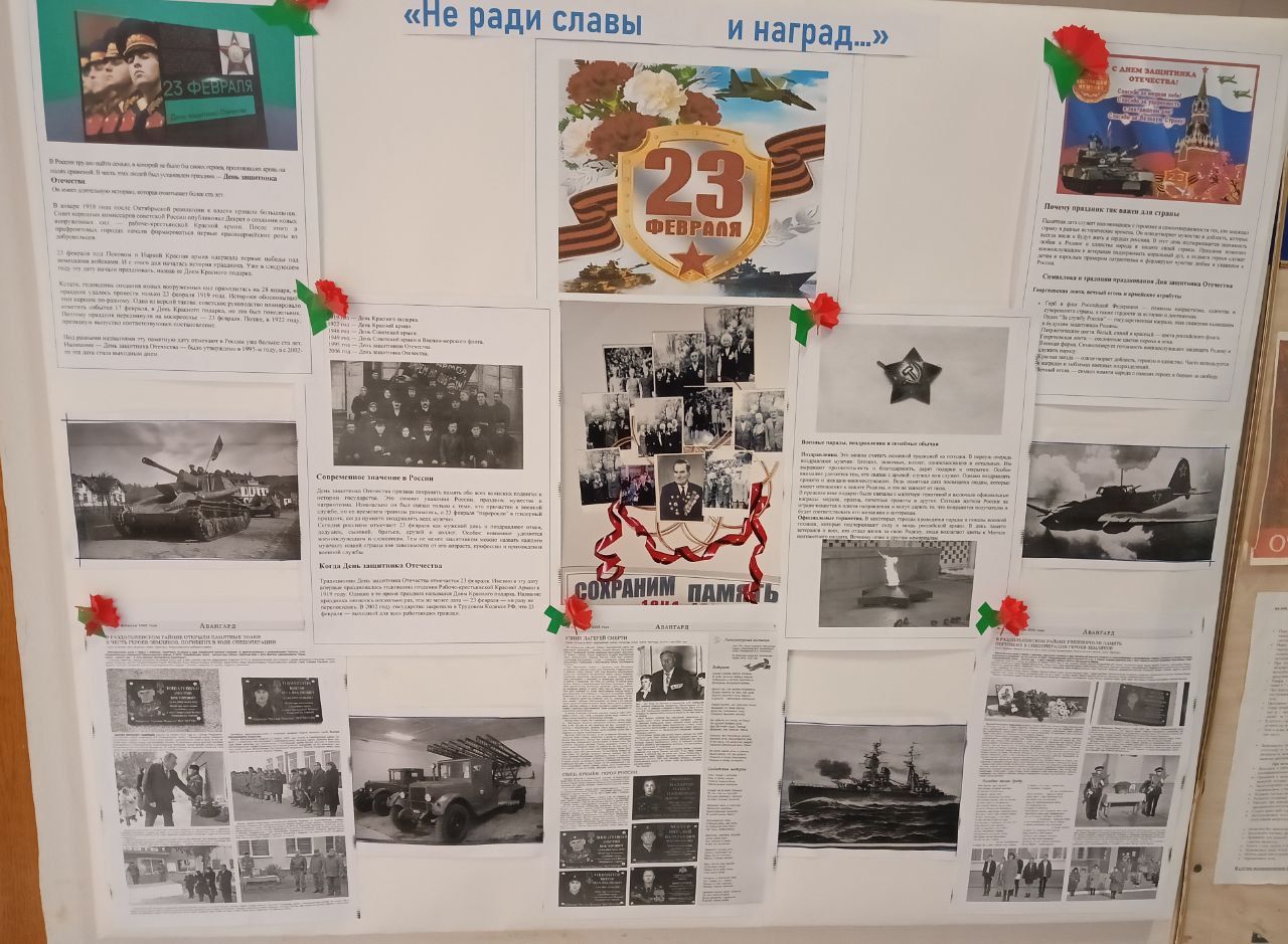 На выставке размещена информация об истории праздника, символике и традиции празднования Дня защитника Отечества, а так же о ветеранах ВОВ, проживавших на территории района и статьи районной газеты «Авангард»" об открытии памятных знаков в память о земляках, героически погибших в ходе специальной военной операции по демилитаризации и денацификации Украины, установленные на фасадах образовательных учреждений Раздольненского района.
