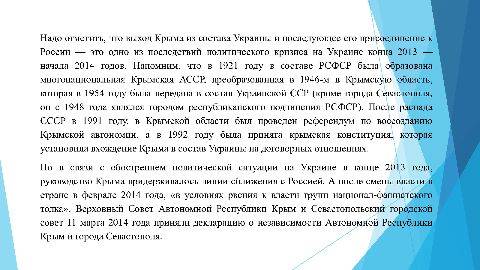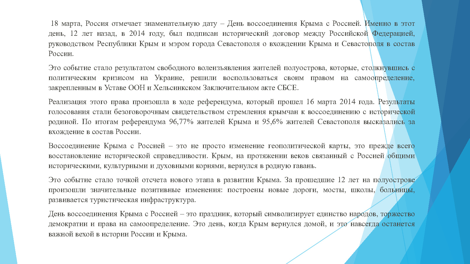 18 марта, отмечается знаменательная дата – День воссоединения Крыма с Россией. Именно в этот день, 12 лет назад, в 2014 году, был подписан исторический договор между Российской Федерацией, руководством Республики Крым и мэром города Севастополя о вхождении Крыма и Севастополя в состав России. Это событие стало результатом свободного волеизъявления жителей полуострова, которые, столкнувшись с политическим кризисом на Украине, решили воспользоваться своим правом на самоопределение, закрепленным в Уставе ООН и Хельсинкском Заключительном акте СБСЕ. Реализация этого права произошла в ходе референдума, который прошел 16 марта 2014 года. Результаты голосования стали безоговорочным свидетельством стремления крымчан к воссоединению с исторической родиной. По итогам референдума 96,77% жителей Крыма и 95,6% жителей Севастополя высказались за вхождение в состав России. Воссоединение Крыма с Россией – это не просто изменение геополитической карты, это прежде всего восстановление исторической справедливости. Крым, на протяжении веков связанный с Россией общими историческими, культурными и духовными корнями, вернулся в родную гавань. Это событие стало точкой отсчета нового этапа в развитии Крыма. За прошедшие 12 лет на полуострове произошли значительные позитивные изменения: построены новые дороги, мосты, школы, больницы, развивается туристическая инфраструктура. День воссоединения Крыма с Россией – это праздник, который символизирует единство народов, торжество демократии и права на самоопределение. Это день, когда Крым вернулся домой, и это навсегда останется важной вехой в истории России и Крыма.