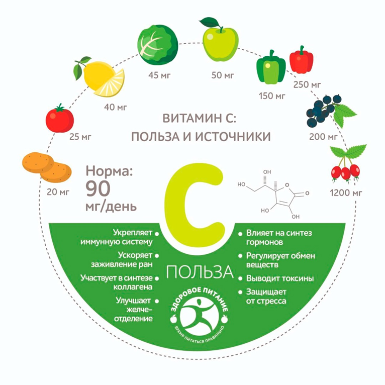 Хотя витамин С часто ассоциируется с защитой от простуд, он участвует во множестве важных процессов в организме. Это водорастворимый витамин, который практически не накапливается в организме, а его избыток выводится с мочой. Витамин С не содержится в жирах, мясе, злаках, молочных продуктах и сладостях.