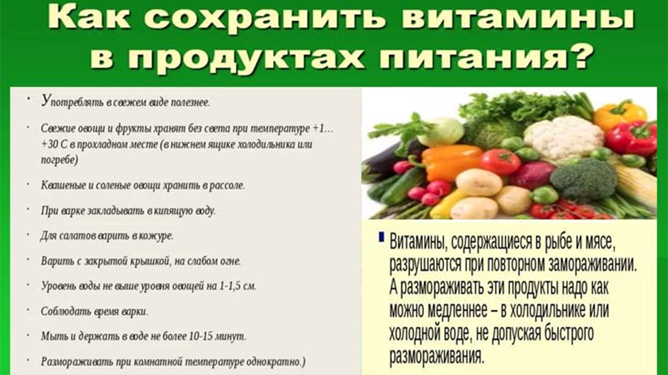 Витамины — это крайне неустойчивые органические соединения. Многие из них начинают разрушаться еще до того, как продукты попадают на сковороду. Неправильное хранение и нерациональная кулинарная обработка могут лишить пищу до 90% её витаминной ценности.